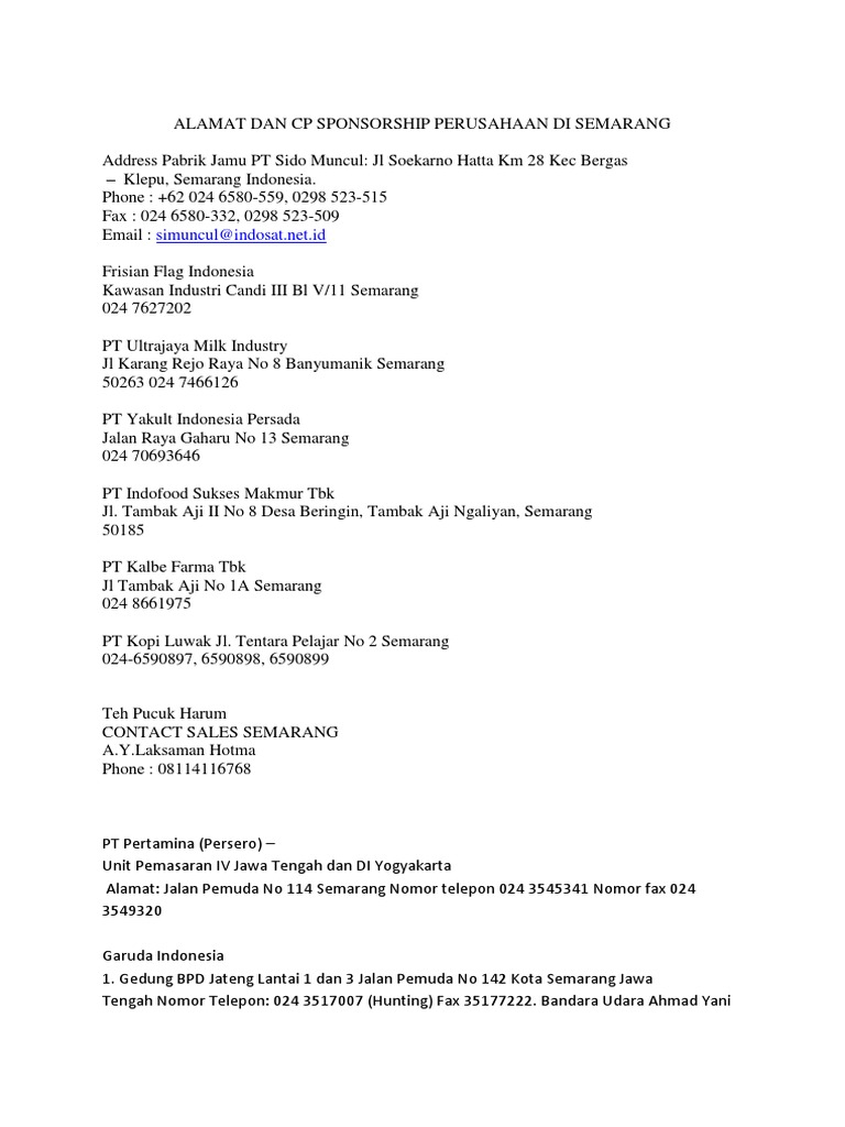 Alamat Dan Cp Sponsorship Perusahaan Di Semarang from imgv2-2-f.scribdassets.com Check spelling or type a new query. We did not find results for: Alamat email pt indofood semarang. Maybe you would like to learn more about one of these?